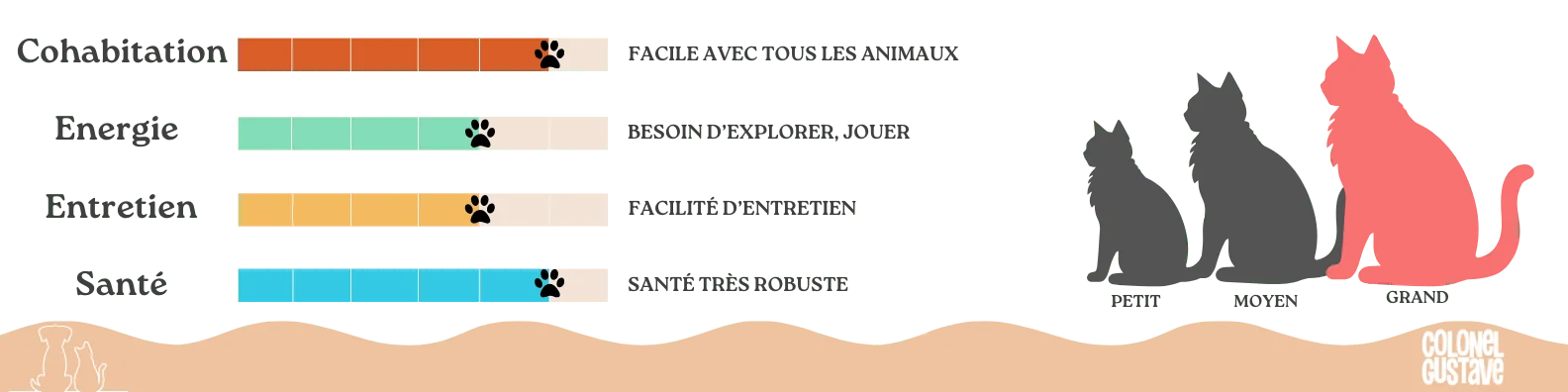 En général, leur taille est d’environ 60 cm peu importe le sexe. Le poids de ce chat peut aller jusqu’à 5 kg pour les femelles et 7 kg pour les mâles.