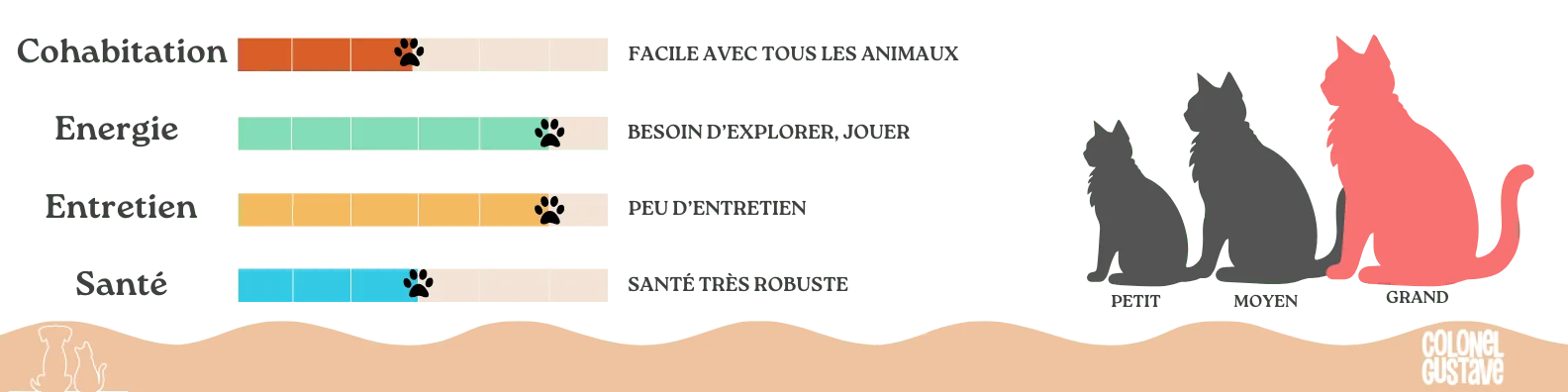 Le Maine coon, avec son corps musclé et robuste, est facilement reconnaissable par sa grande taille. Cette caractéristique fait de lui une des races domestiques les plus imposantes.